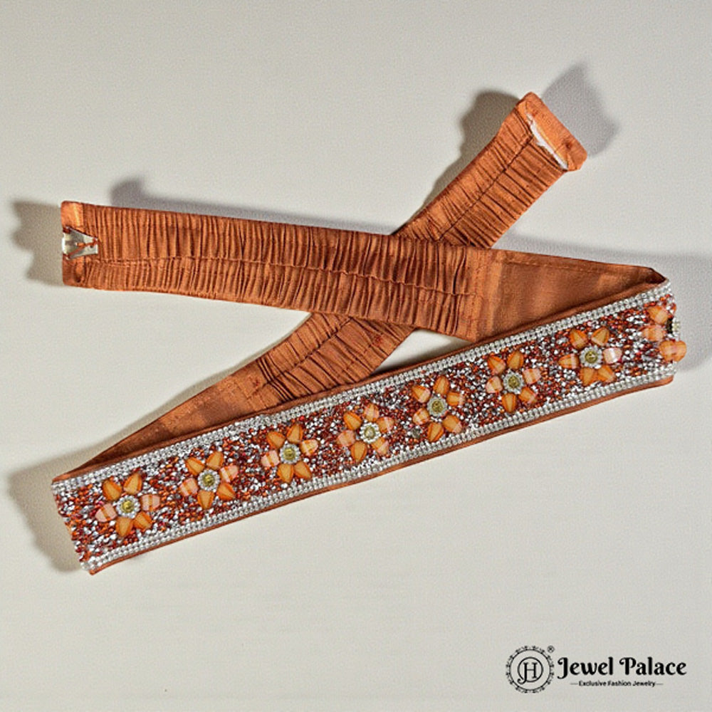 Elevate your traditional look with this exquisite Handmade Aari Work Hip Belt, crafted on premium Art Silk Fabric. Designed with intricate floral temple motifs, sparkling stones, and delicate pearl drops, this hip belt adds a royal charm to bridal and festive outfits. The adjustable tie-up closure ensures a comfortable fit on all waist sizes.