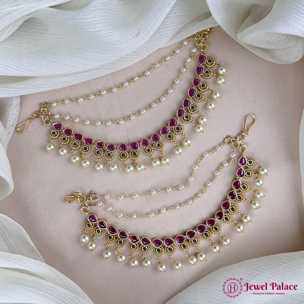 Graceful antique gold–finish ear chain mattal adorned with sparkling stones and delicate pearl drops. A perfect South Indian traditional accessory that adds royal elegance to bridal and festive looks.