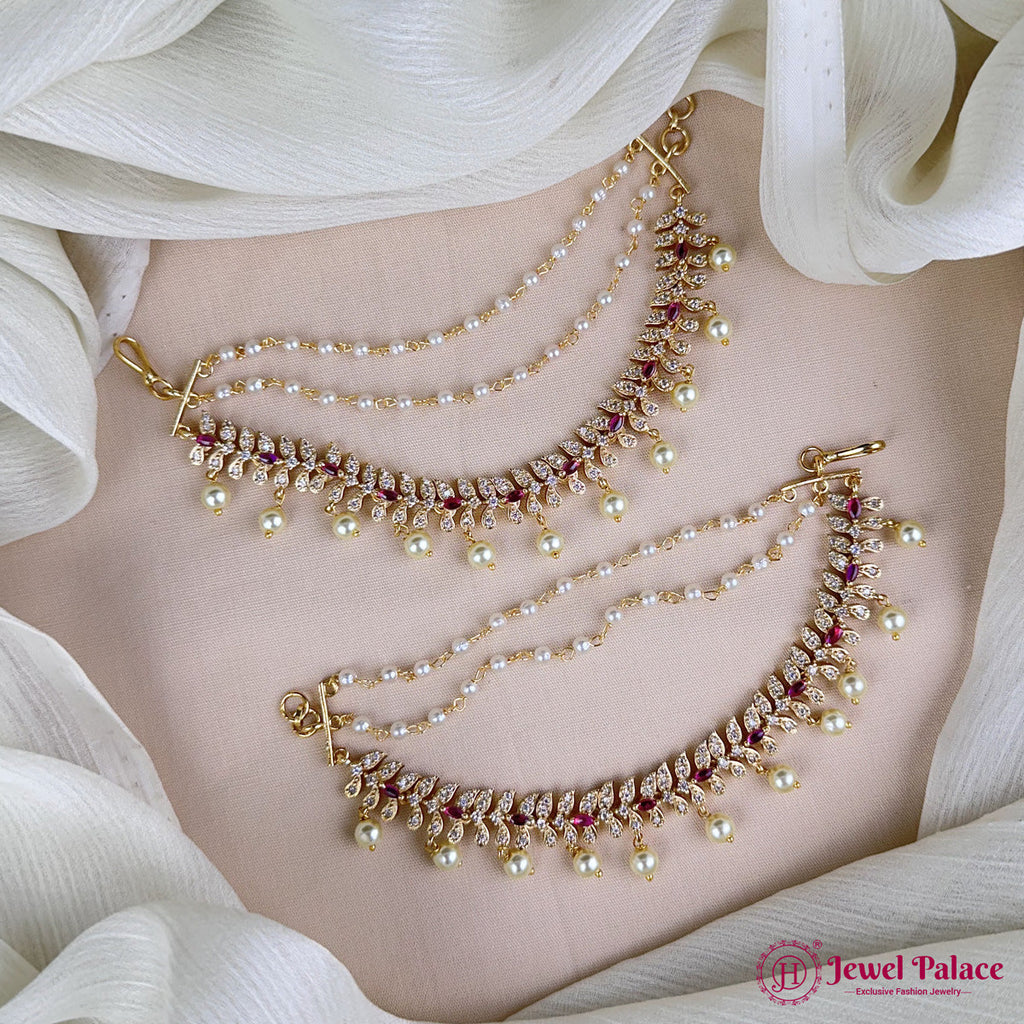 Graceful antique gold–finish ear chain mattal adorned with sparkling stones and delicate pearl drops. A perfect South Indian traditional accessory that adds royal elegance to bridal and festive looks.