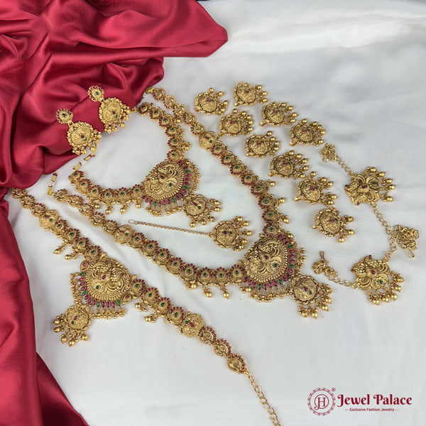 • Package Details: 1 Necklace, 1 Long Necklace/Haram, 1 Pair Of Earrings, 1 Mathapatti, 1 Hip Belt, 1 Set of Hair Accessories(9Pcs.)As Per Images, 1 Pair of Wanki
