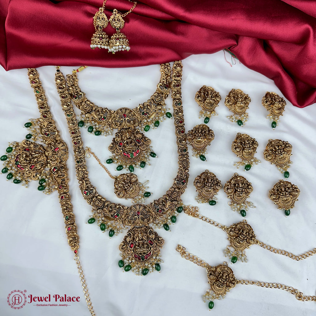 - Package Details: 1 Necklace, 1 Long Necklace/Haram, 1 Pair Of Earrings, 1 Mathapatti, 1 Hip Belt, 1 Set of Hair Accessories(9Pcs.)As Per Images, 1 Pair of Wanki