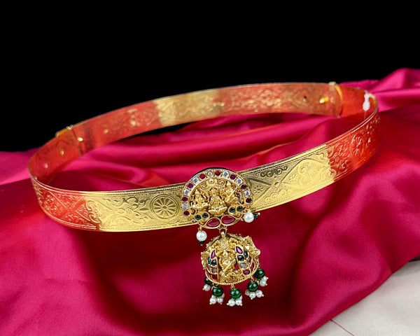 Add a touch of timeless elegance to your ethnic look with this beautifully crafted gold-plated traditional hip belt (kamarbandh). Designed with intricate temple-inspired motifs and shimmering gold finish, this waist belt perfectly complements sarees, bridal wear, and festive outfits.