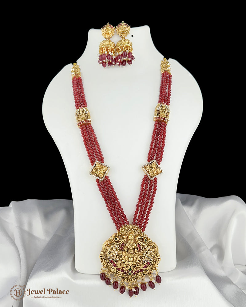 Red beaded necklace with gold accents and matching earrings on a white stand, branded 'Jewel Palace'.