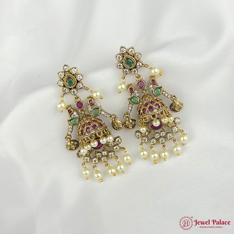 Handcrafted temple-style jhumka earrings with intricate motifs, ruby and green stone detailing, and pearl drops. Ideal for traditional sarees and ethnic occasions.