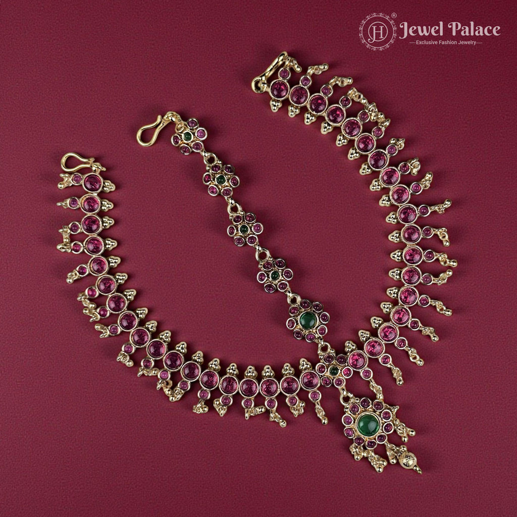 Beautiful Antique Gold Temple Wedding Maang Tikka crafted in a classic South Indian design. Adorned with traditional ruby and green Kemp stones, this premium piece features a rich matte gold finish and intricate detailing. Perfect for bridal wear, weddings, and festive occasions.