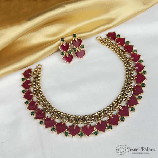 Embrace timeless South Indian elegance with our exquisite Palakka Necklace, a stunning creation inspired by traditional Kerala temple jewellery. Crafted with intricate detailing, this necklace features signature Palakka stones paired with delicate ruby red accents and gold-finish motifs that exude royal charm.