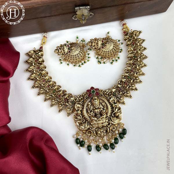 Beautiful Gold Finish Kemp Stone Temple Necklace Set JH5853