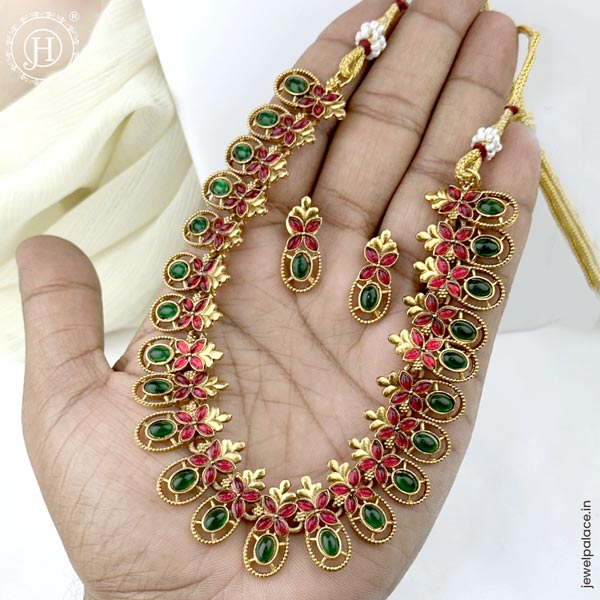 - MATERIAL: The metal is fine quality matte gold plated that gives a rich & glossy finish to the set. The glittering finish combined with the ruby green stones gives a unique Maharani look to the jewelry set. The metal is strong and long-lasting.
