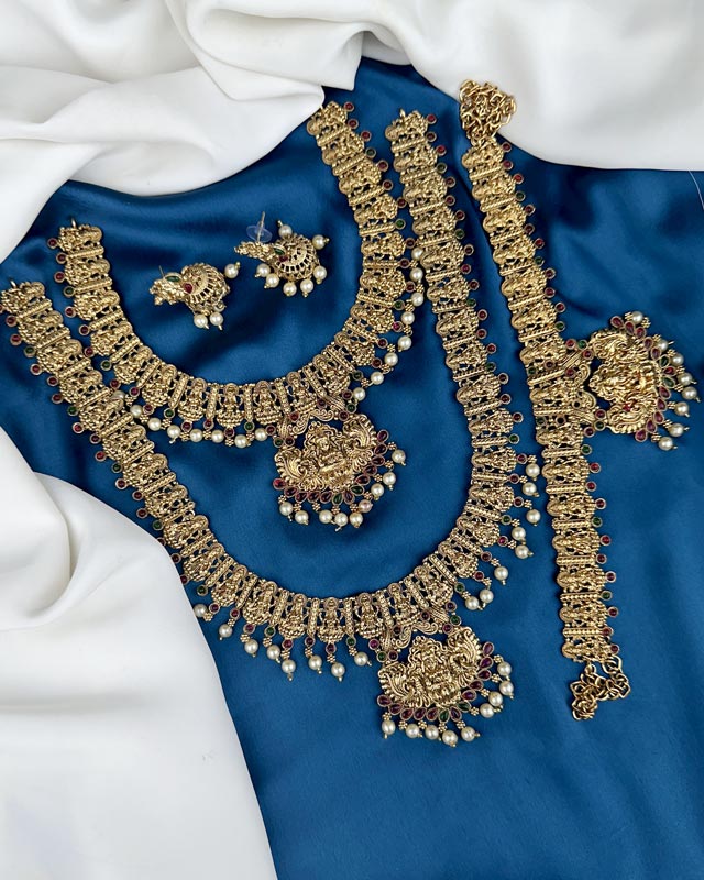 | Content In The Box | 1 Necklace | 1 Long Haram | 1 Hip Belt | 1 Pair Earrings Jhumka | 1 Tikka |