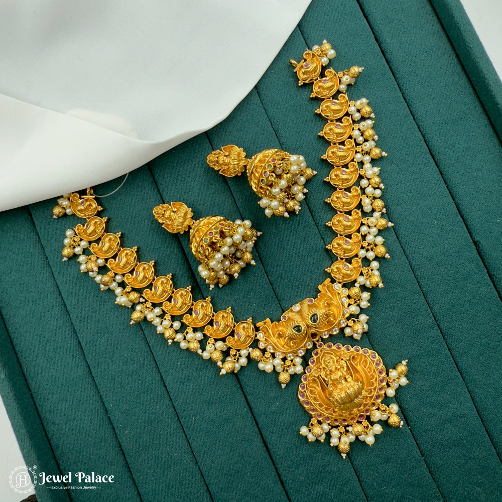 Premium Antique Gold Finish Temple Necklace Set with Lakshmi Motifs JH7190