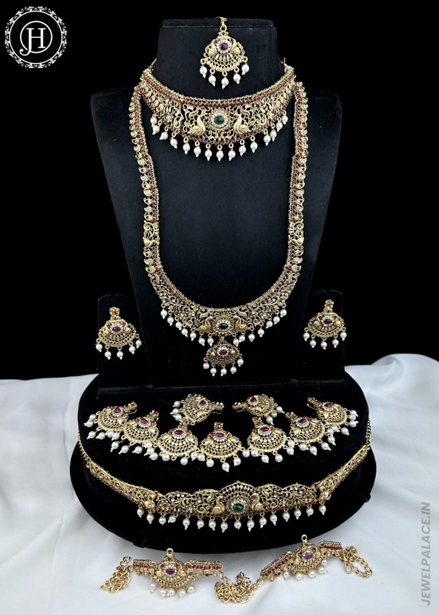 - Package Details: 1 Necklace, 1 Long Necklace/Haram, 1 Pair Of Earrings, 1 Mathapatti, 1 Hip Belt, 1 Set of Hair Accessories as Per Images, 1 Pair of Wanki
