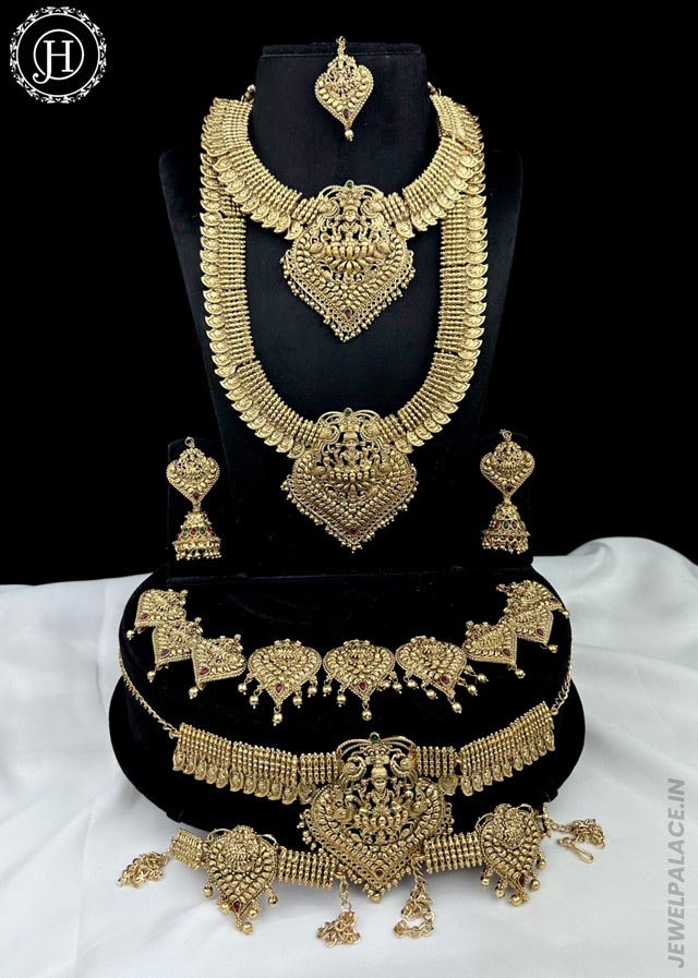 - Package Details: 1 Necklace, 1 Long Necklace/Haram, 1 Pair Of Earrings, 1 Mathapatti, 1 Hip Belt, 1 Set of Hair Accessories as Per Images, 1 Pair of Wanki