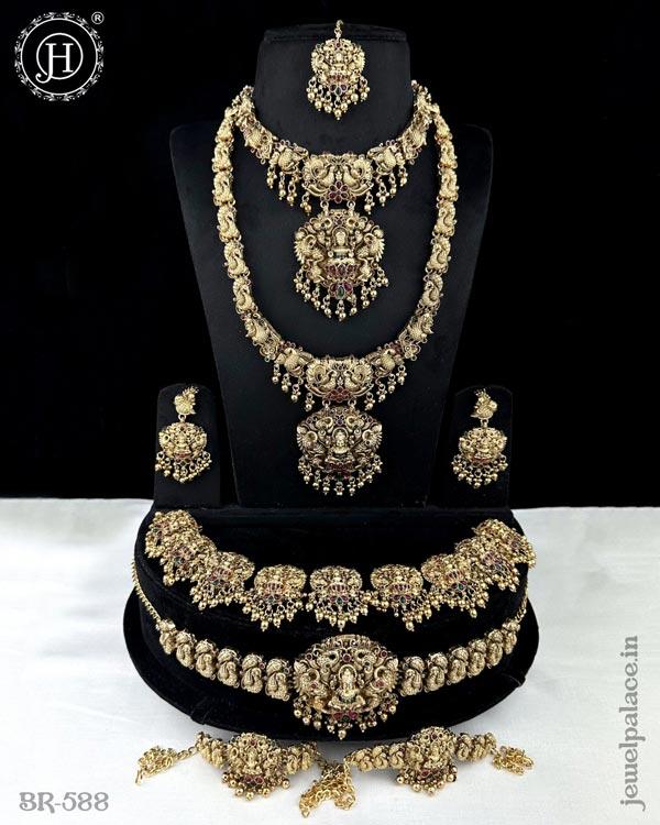 - Package Details: 1 Necklace, 1 Long Necklace/Haram, 1 Pair Of Earrings, 1 Mathapatti, 1 Hip Belt, 1 Set of Hair Accessories as Per Images, 1 Pair of Wanki