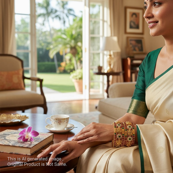 Add a touch of timeless elegance to your look with these stunning Lotus Design Bangles. Crafted with a rich gold finish, these bangles feature beautifully detailed red lotus motifs highlighted with green accents, making them perfect for festive occasions, weddings, and traditional celebrations. Lightweight yet luxurious, they bring together tradition and style in every detail. A must-have addition to your jewelry collection.