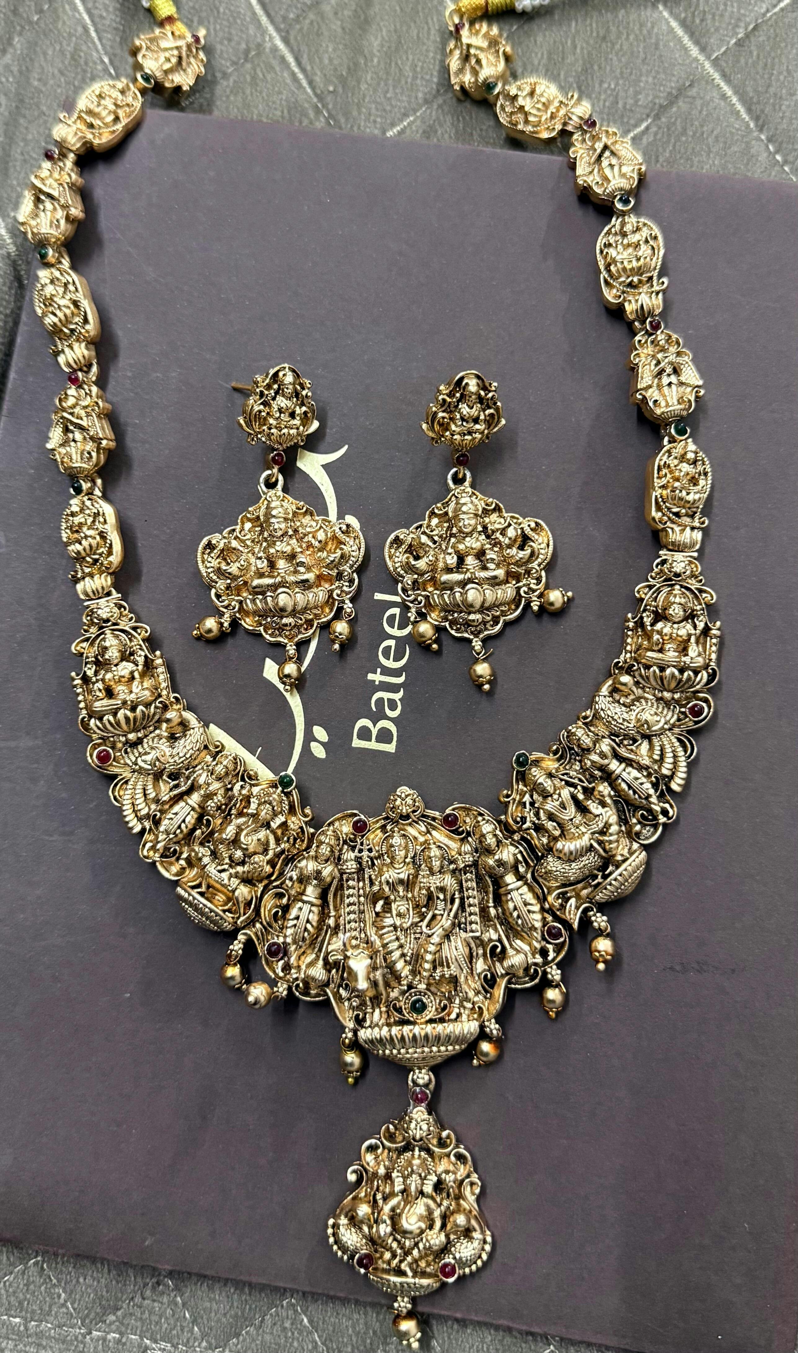 Elevate your style with our exquisite gold-plated traditional Antique Long Haram. Ram Parivar Trendy Traditional Antique Long Haram. Perfect for special occasions, its intricate craftsmanship beautifully merges culture and tradition, adding a touch of timeless elegance to your look.